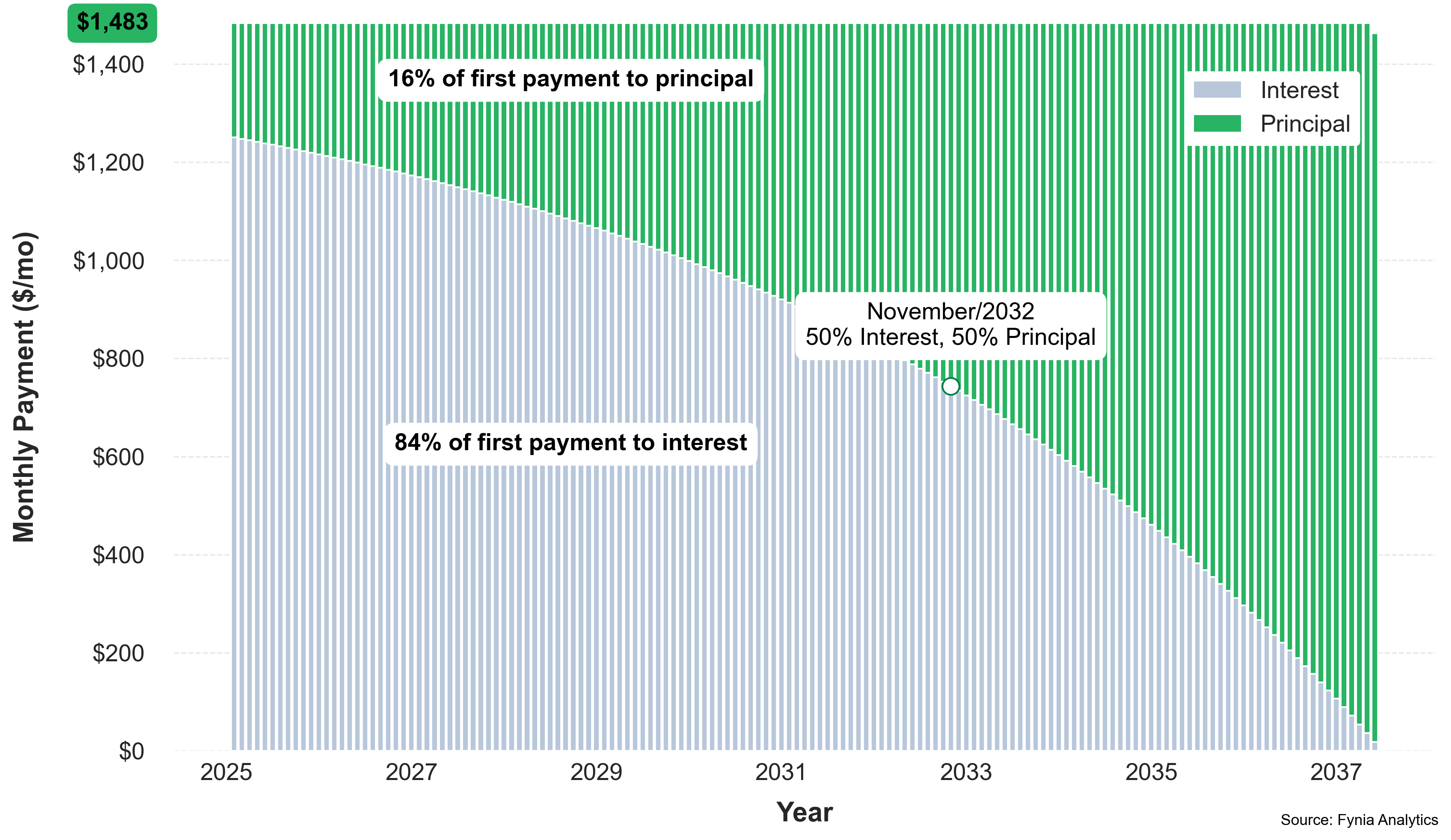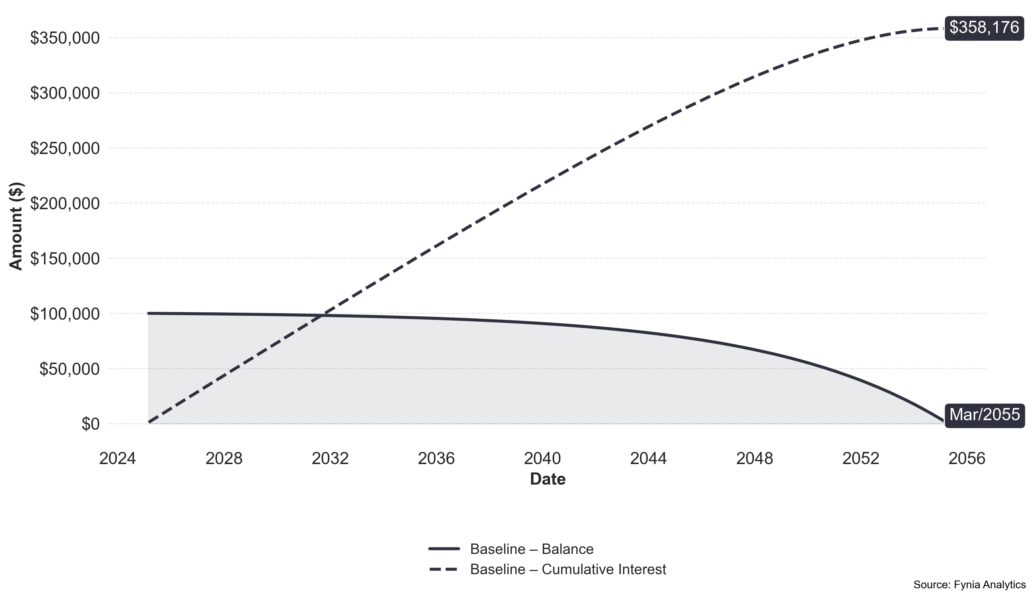By maintaining a monthly payment of $1,264, you would incur $358,176 in interest, with a total repayment of $458,176. Your loan would be fully paid off in 30y 2mo in March 2055. Now, let's explore the payment alternatives proposed by Fynia.