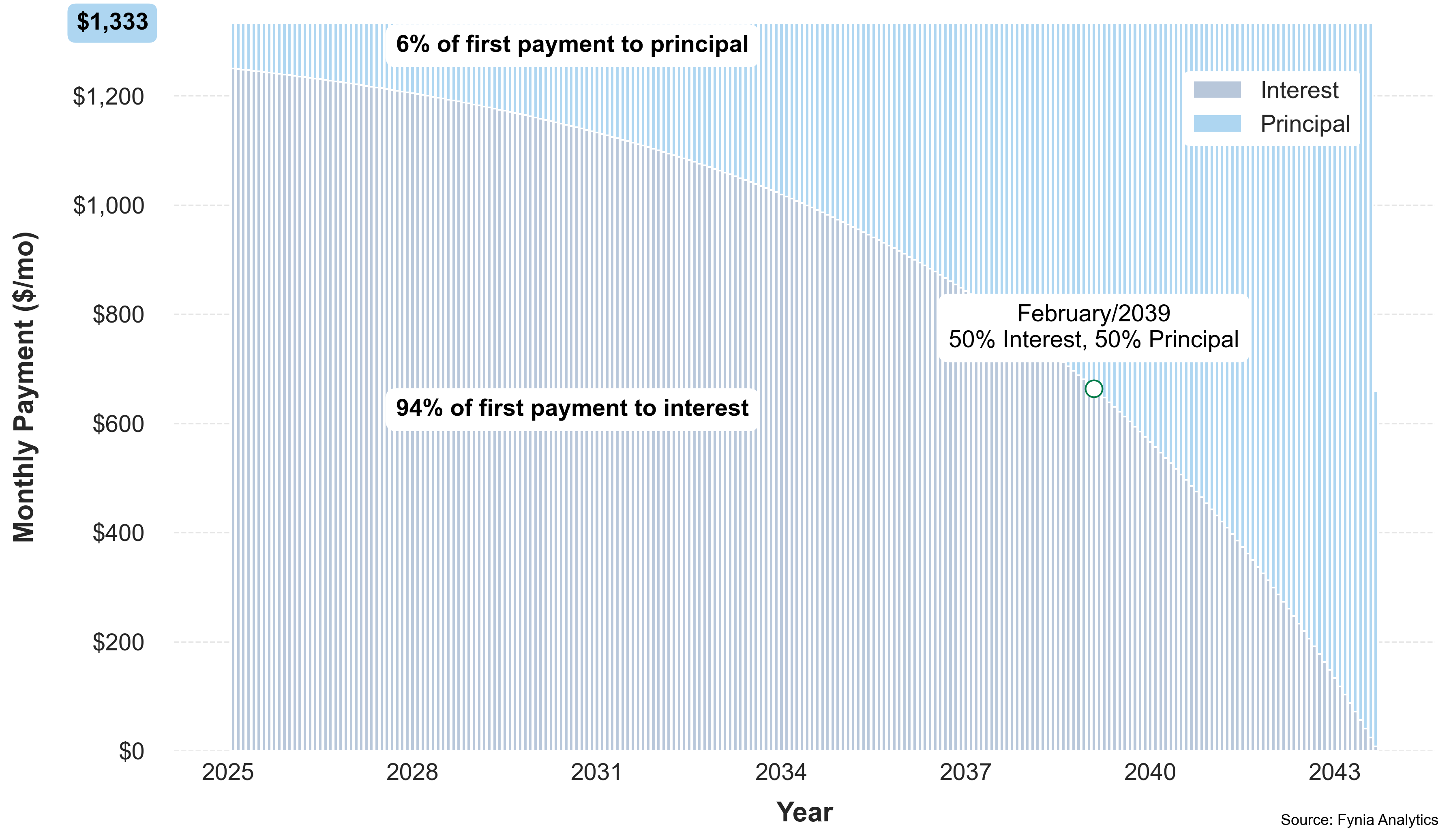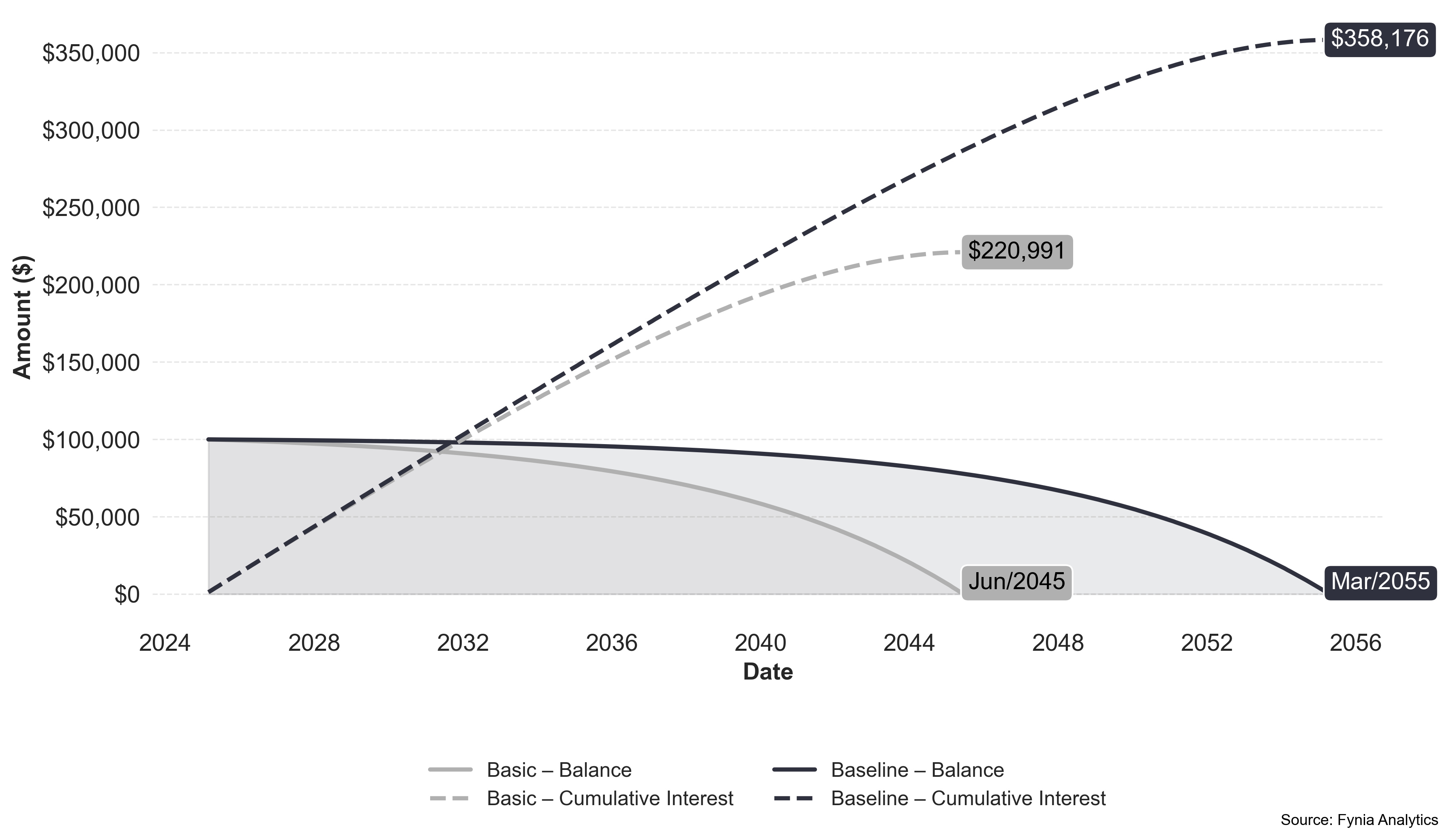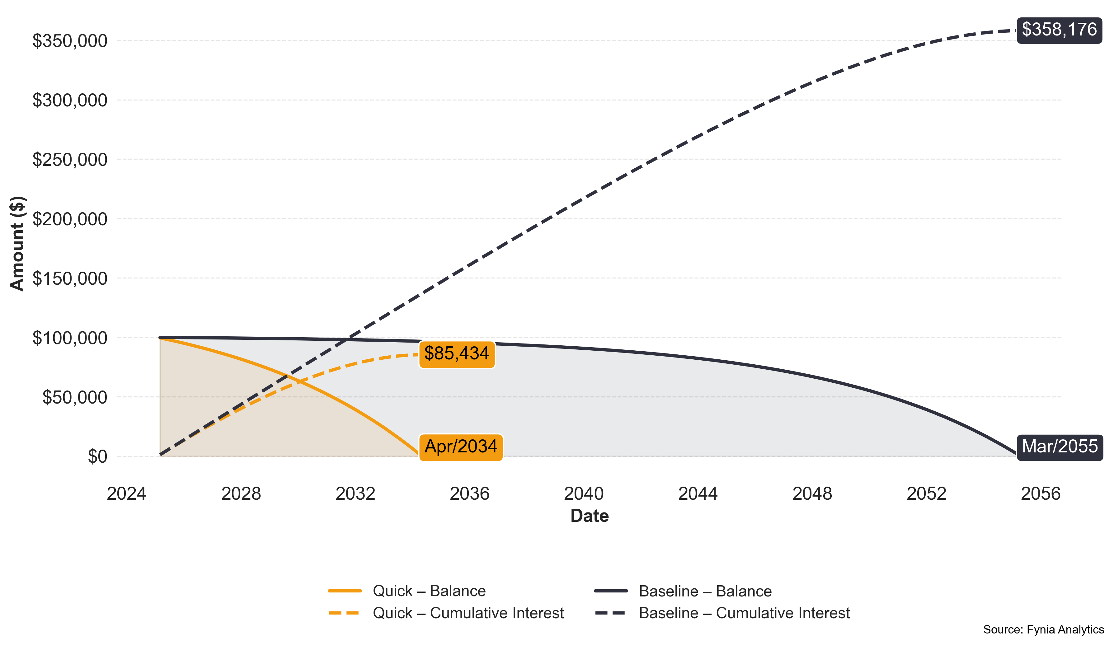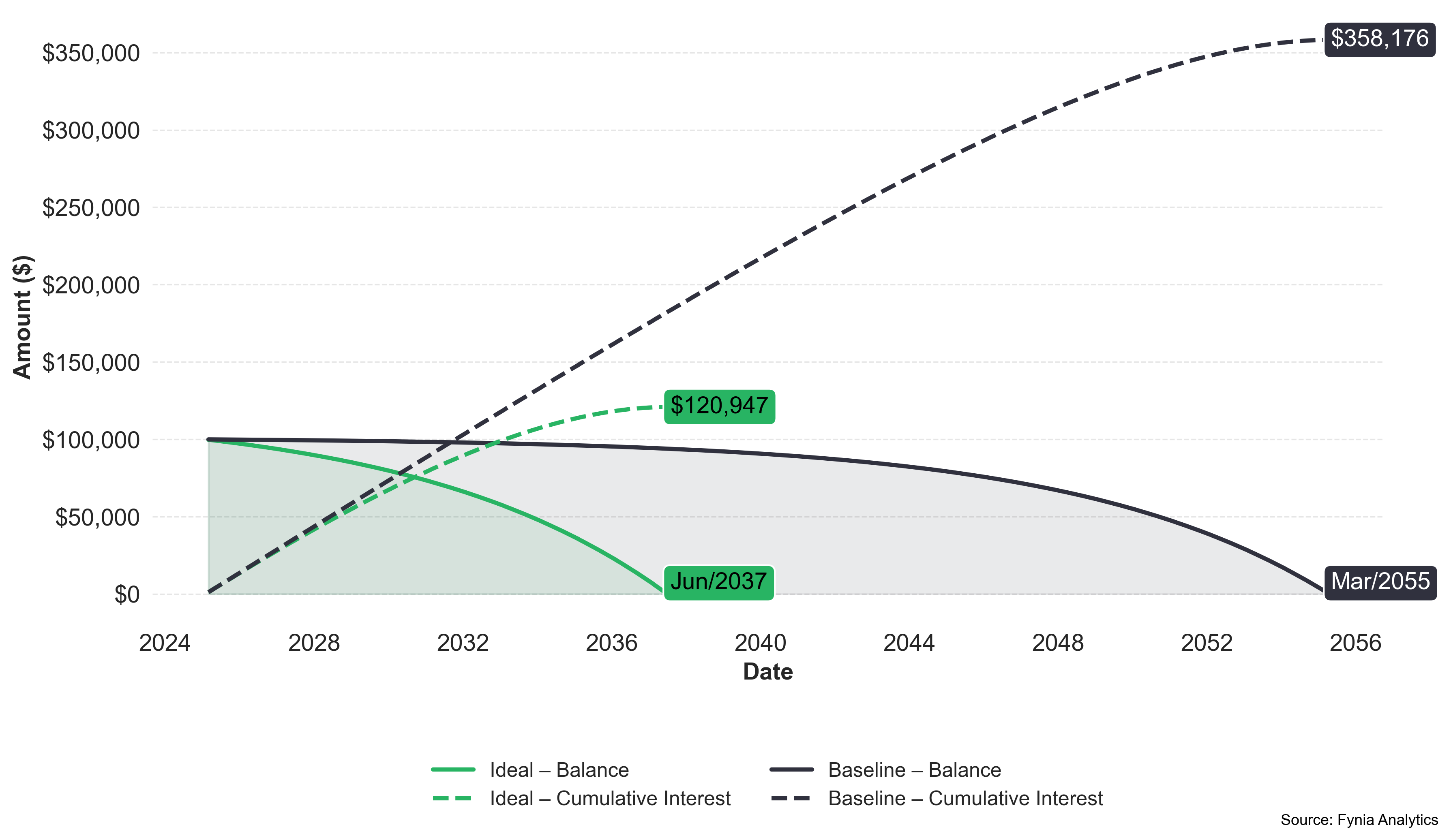 Payment efficiency helps you get more from every installment. The chart below is tailored to your loan and shows how efficiency changes as monthly payments increase. Fynia’s suggested options help you pay smarter, balancing monthly cost with total interest saved.