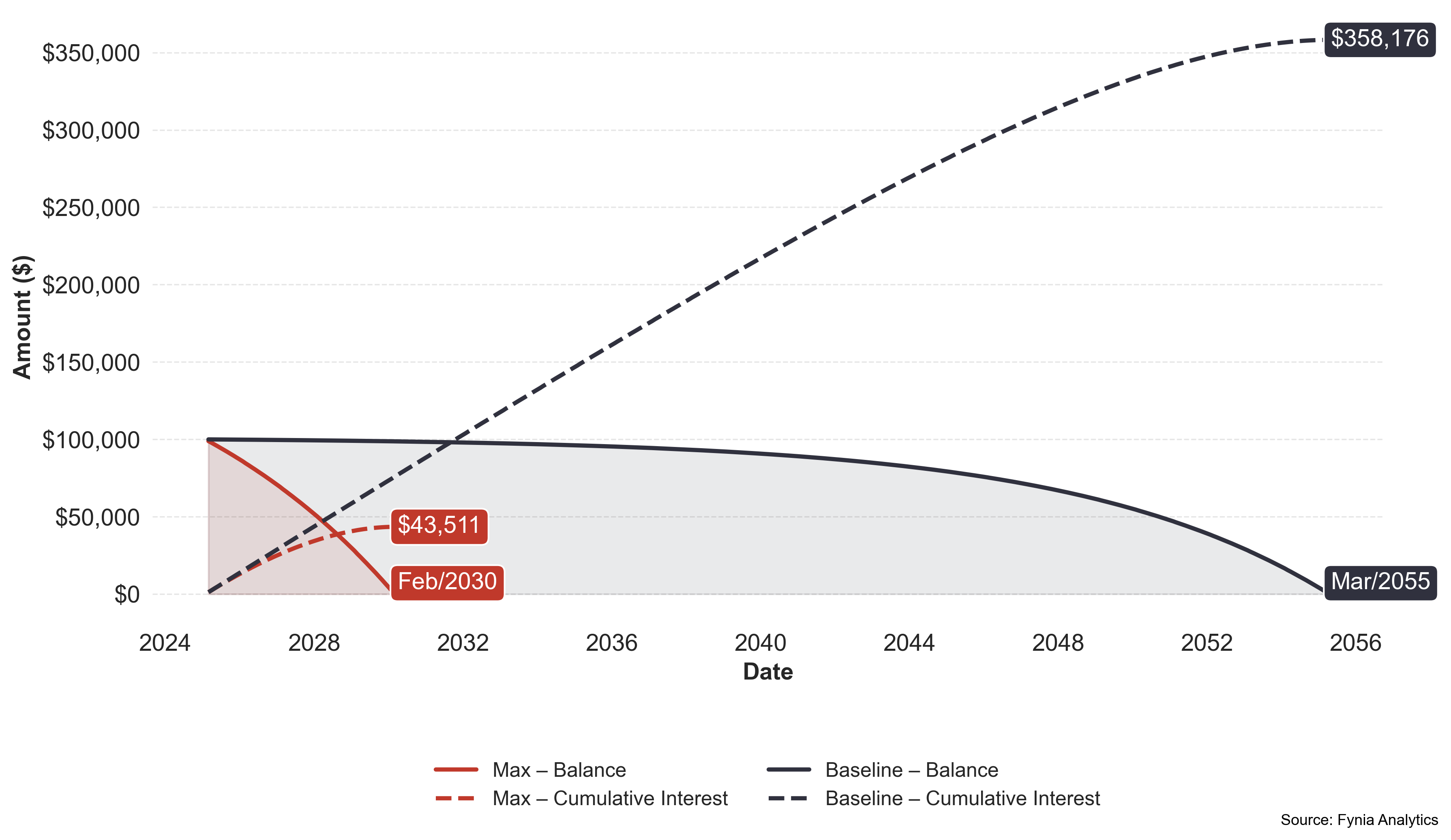 The Max option pushes the monthly payment to a practical ceiling: a 86.2% increase delivers a 87.9% reduction in interest and a 83.2% shorter term—yielding a +1.7 pp advantage (interest reduction minus payment increase) vs Baseline. In nominal terms, that’s +$1,089/mo to save about $314,665 and cut 25y 1mo from the schedule. Note: treat Max as an upper boundary—going beyond this level reduces overall efficiency and can turn negative.