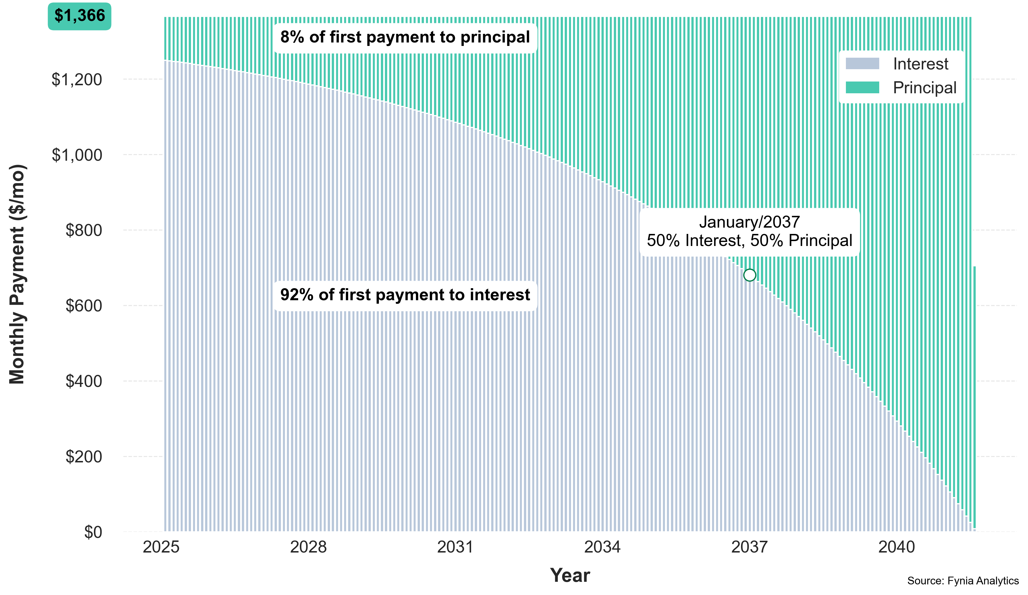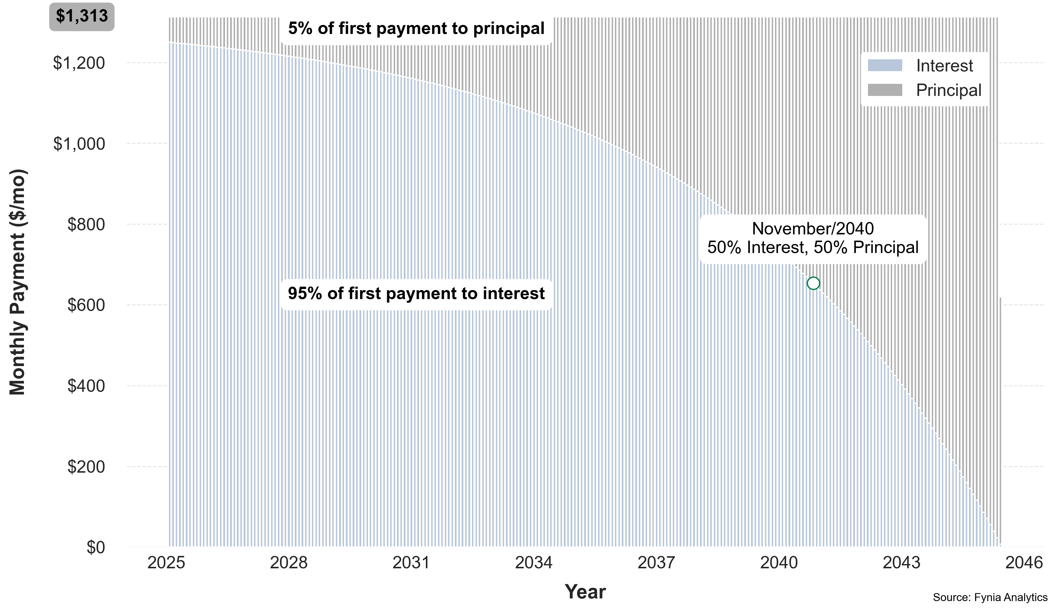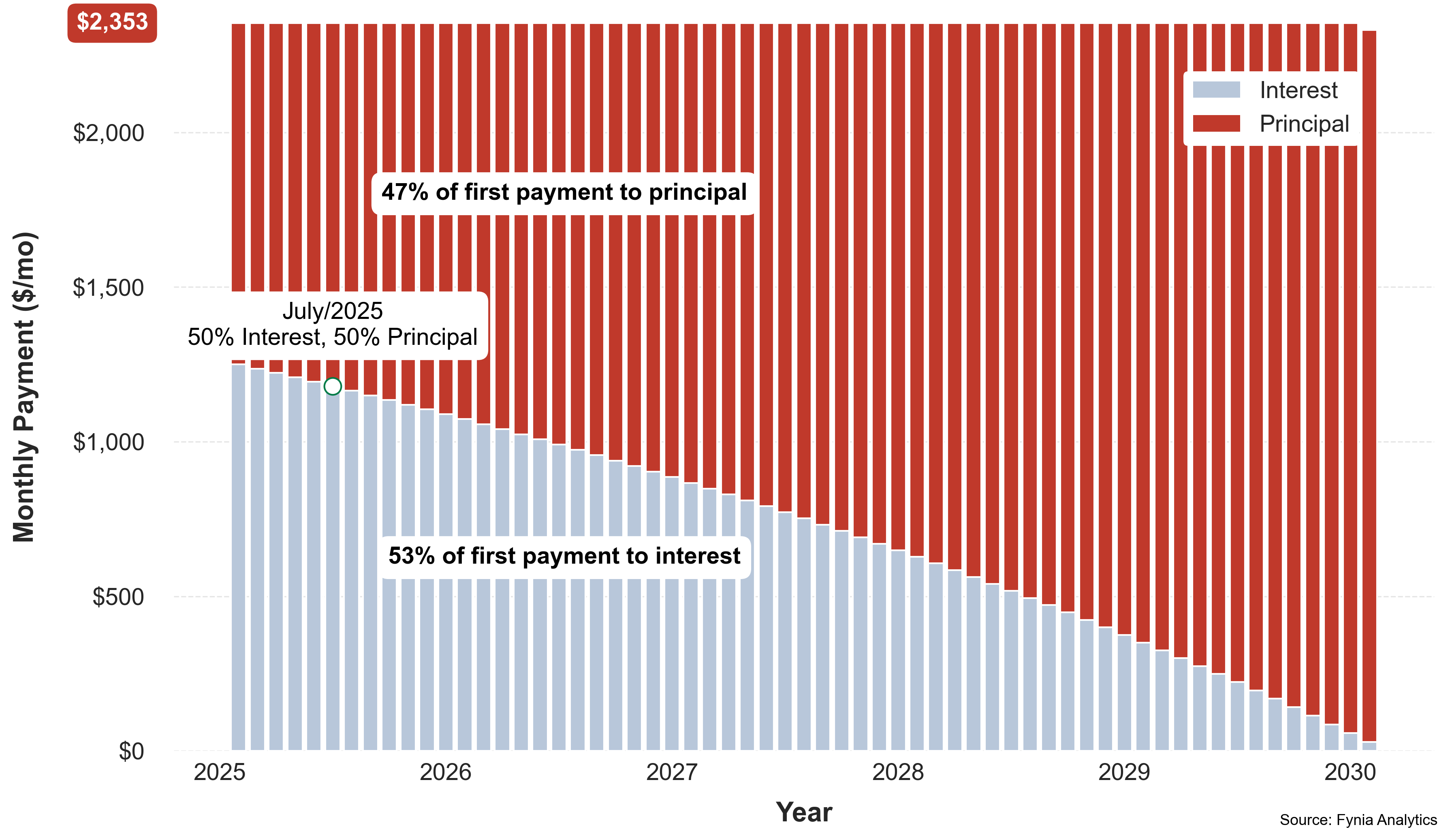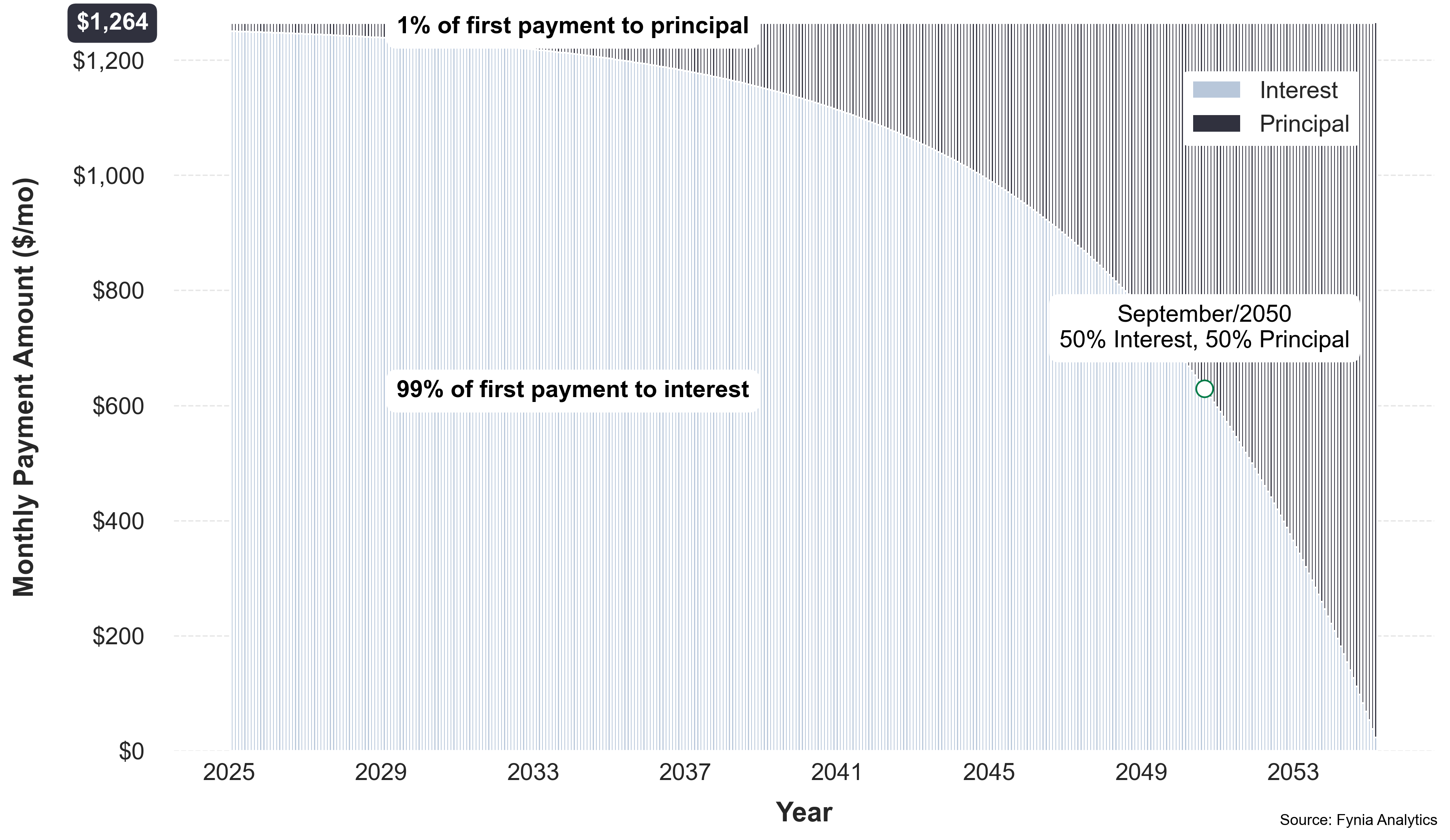 By maintaining a monthly payment of $1,264, you would incur $358,176 in interest, with a total repayment of $458,176. Your loan would be fully paid off in 30y 2mo in March 2055. Now, let's explore the payment alternatives proposed by Fynia.