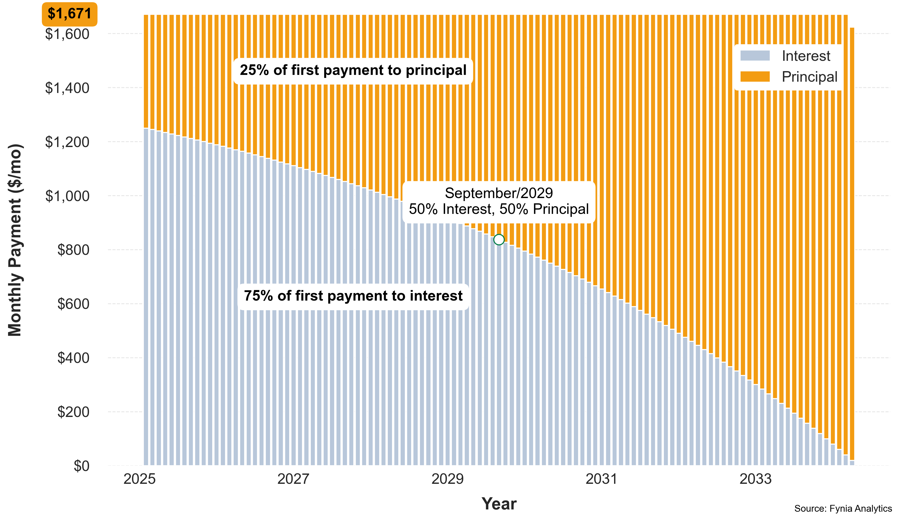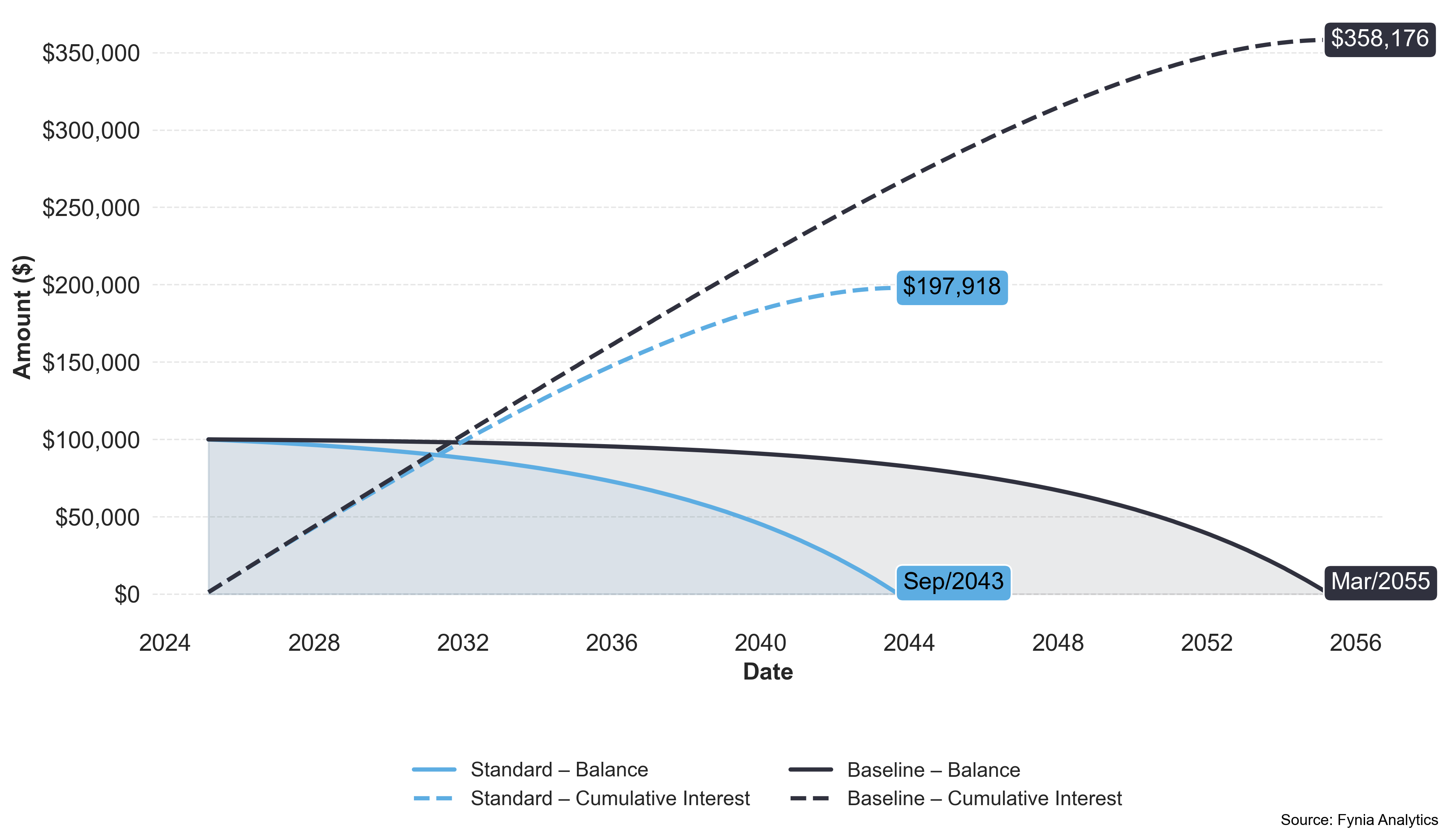 Payment efficiency helps you get more from every installment. The chart below is tailored to your loan and shows how efficiency changes as monthly payments increase. Fynia’s suggested options help you pay smarter, balancing monthly cost with total interest saved.
